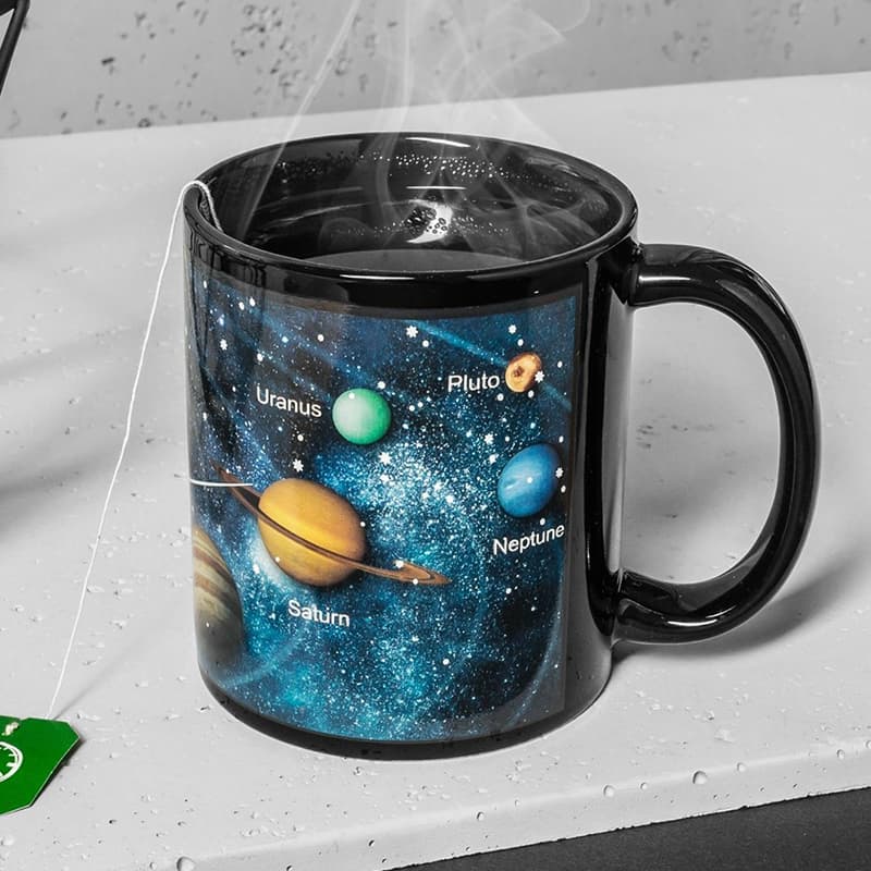 Чаша Слънчева система за кафе и чай, която променя вида си при топлата напитка – от тъмно звездно небе до спираща дъха гледка със Слънцето и всички планети от слънчевата система в Космоса! Взе ли своята?