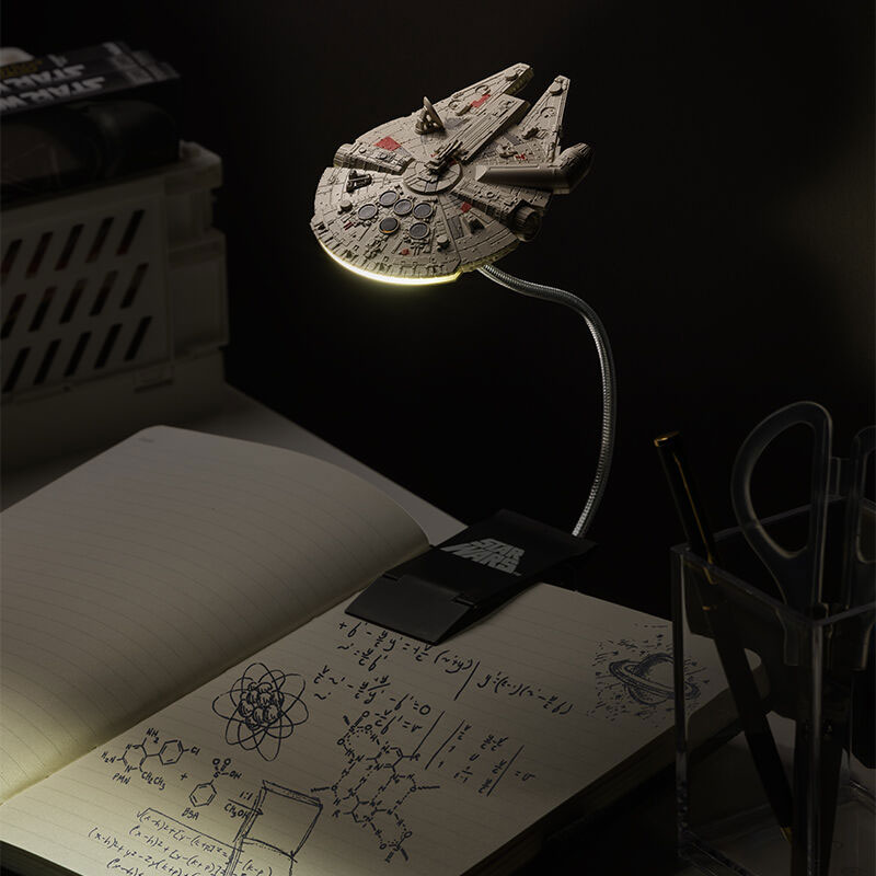 Подари лампа за четене на книга или рисуване с щипка Star Wars Millennium Falcon! Можеш да я защипеш за повърхност и да я преместиш без усилие. Идеална за достатъчно светлина вечер. Подари лампата с щипка на фен на Междузвездни войни!