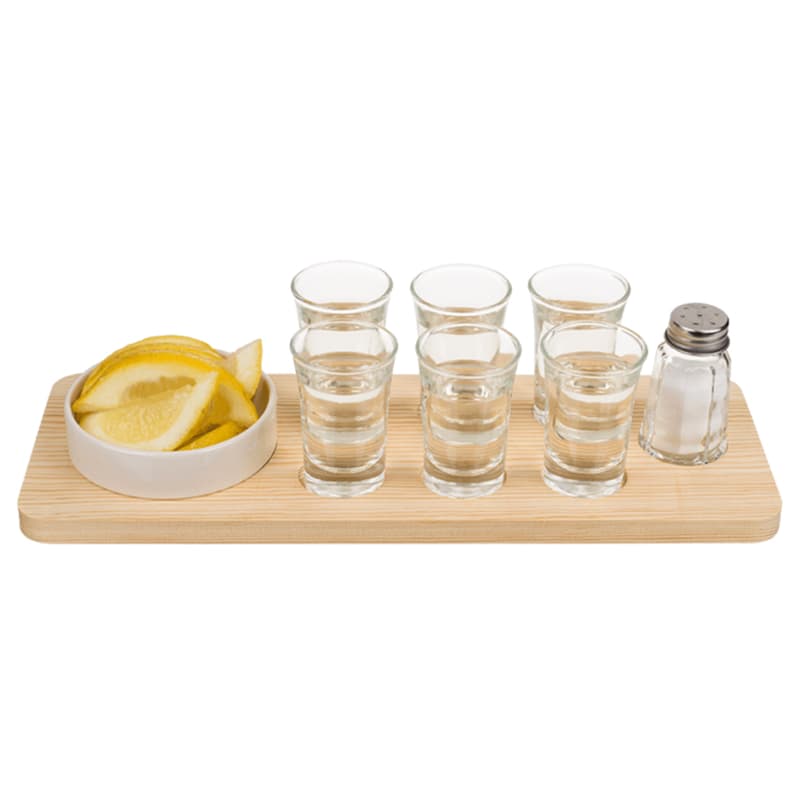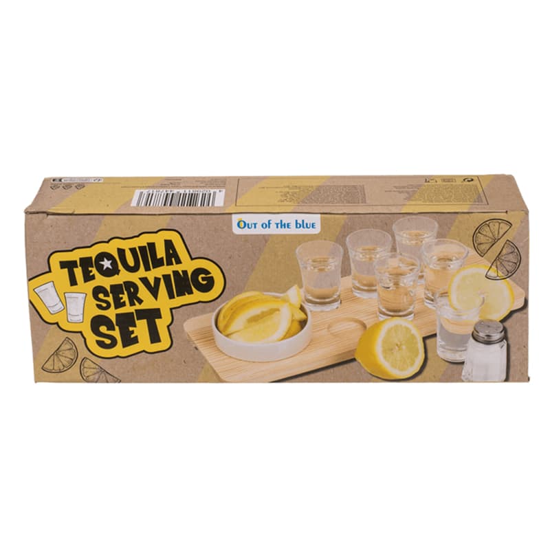 Комплектът за сервиране на текила идва с дървена поставка, в която може да сложите 6 чаши за шот, направени от стъкло, малка солница (метал и стъкло) и керамична купичка за резънчета лимон. Какво повече Ви трябва? А, да – текила. Еми, нея ще трябва да я вземете отделно. Само не прекалявайте и консумирайте отговорно, че на следващия ден е тежко.