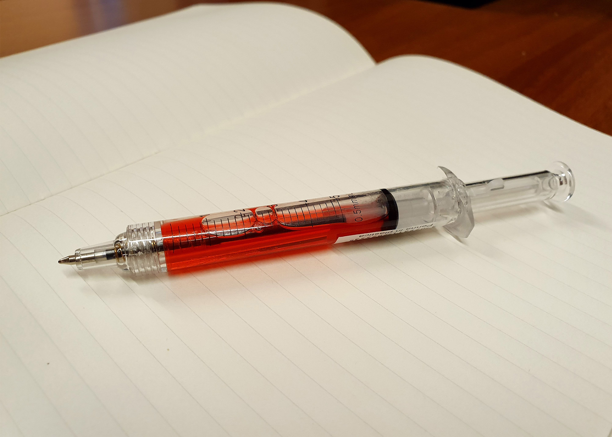 Химикалка във формата на спринцовка.