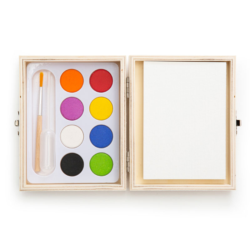 Комплектът се състои от 8 цвята водни бои, четка, пипета и листа за рисуване.