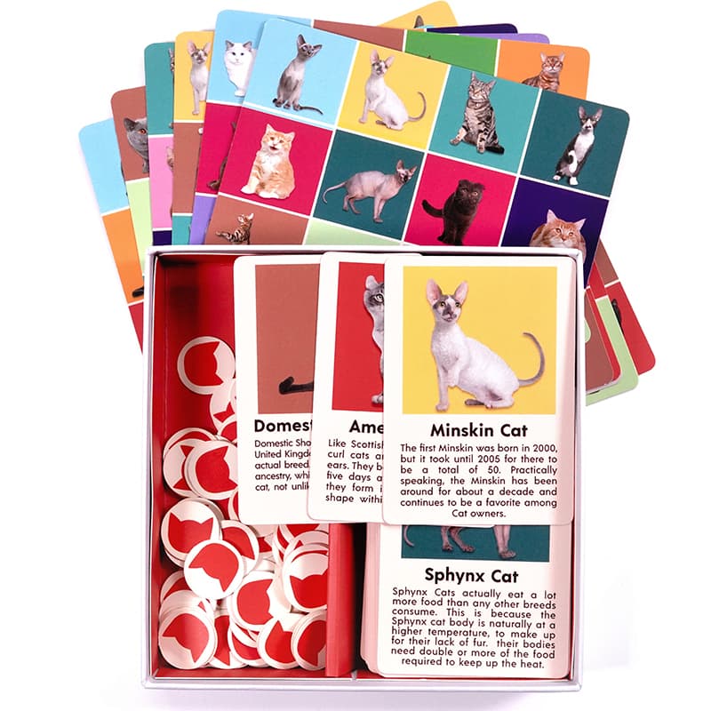 Играта съдъжа снимки на 72 котешки породи, 8 бинго карти, 36 карти с котки, 72 игрови пула с котешка пиктограма и книжка с правилата на играта.