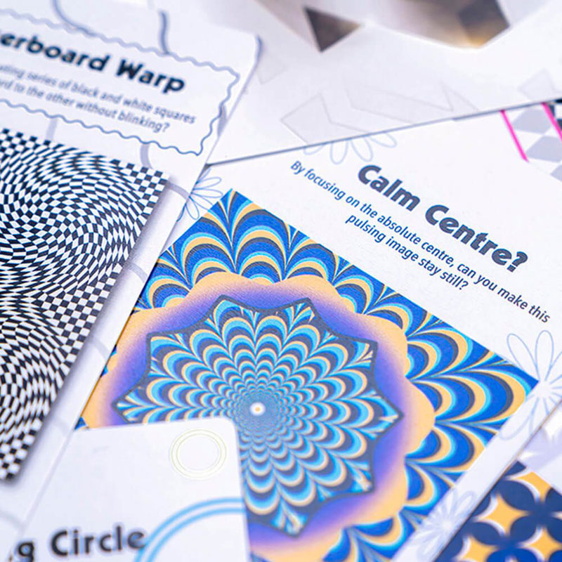 Колодата съдържа 50 карти с оптически илюзии и необичайни снимки, които ще ви накарат да се замислите върху това дали наистина виждате добре.